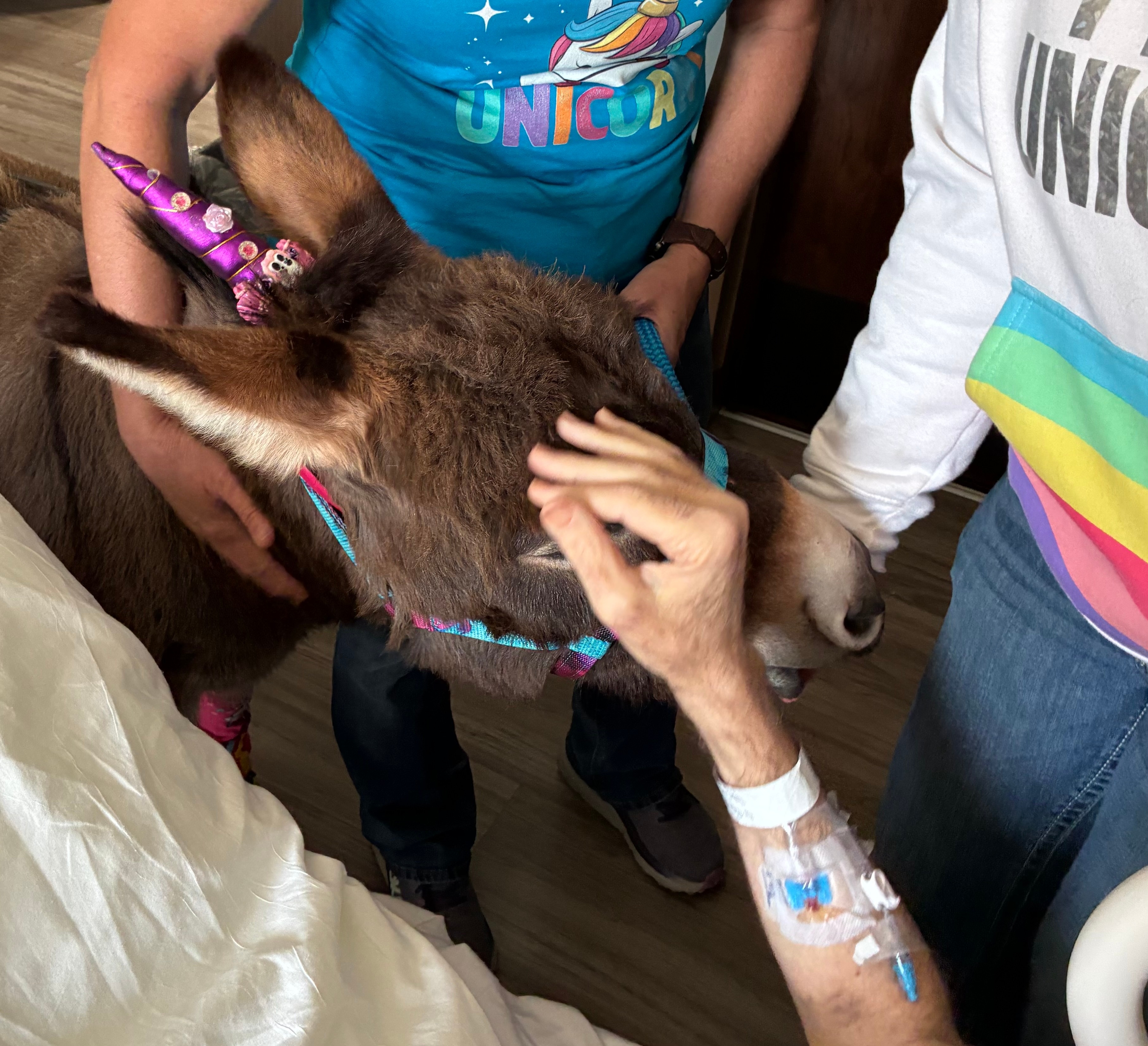 The visit coincided with National Unicorn Day, and the donkeys arrived dressed as unicorns, bringing smiles and laughter to patients, families, and staff throughout the day.